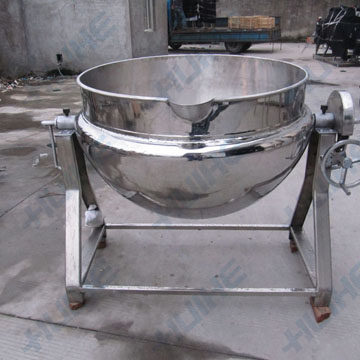 燃?xì)鈯A層鍋:就是人工打開氣閥,點(diǎn)燃燃?xì),加入食用油,待油溫達(dá)到烹飪溫度時(shí),加入適量的物料,人工翻鍋、攪拌,使物料在鍋里均勻受熱。待物料加工完畢后,關(guān)氣熄火,轉(zhuǎn)動(dòng)手柄,通過(guò)蝸輪、蝸桿傳動(dòng)裝置,使鍋體旋轉(zhuǎn)傾斜,將物料倒入另一容器內(nèi)。