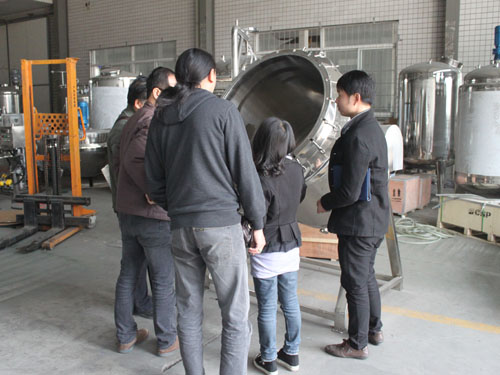 圖為客戶參觀準備包裝發(fā)貨的立式夾層鍋
