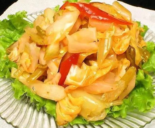 做法:1)圓白菜洗干凈,用手掰成小塊,黃瓜洗凈,切成稍厚一點的片, 將小塊的圓白菜和切成片的黃瓜放入大盆中,灑入食鹽,拌勻,進行腌制。