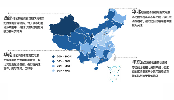 從地區(qū)上看,華北地區(qū)(除北京和天津兩個直轄市外)整體比例較低,西部地區(qū)比例很高,另外長江流域省份也相對較高。一線城市消費者對于液態(tài)奶健康方面的需求相對更加看重;二、三線城市以及其他中小城市則更加關注液態(tài)奶的味道、美容減肥效果、滿足小孩喜好等,且更易受身邊朋友的影響。