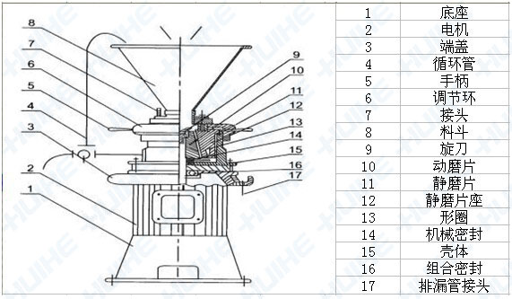 立式膠體磨其主要構(gòu)造由磨頭部件、底座傳動部;專用電機三部分組成。其主機部份由殼體、定子、轉(zhuǎn)子、調(diào)節(jié)機構(gòu)、冷卻機構(gòu)、電機等組成。具體請看下圖: