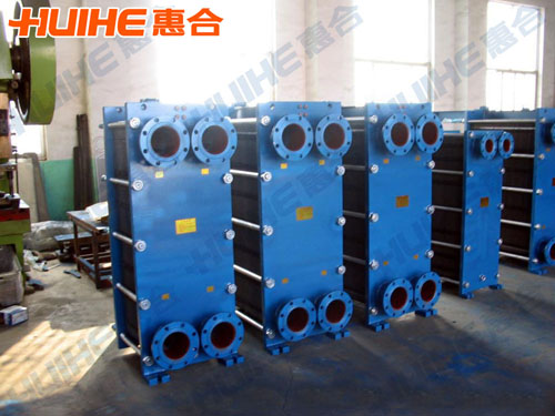 板式換熱器是由固定擋板、板片、移動(dòng)擋板、立柱、上導(dǎo)軌、下導(dǎo)軌及固定螺栓組成。在固定擋板及移動(dòng)擋板之間是一系列被固定的板片。每片板片均有墊圈,所以板片間構(gòu)成相互平行的封閉流道,介質(zhì)在每兩塊板片之間交替流動(dòng)。