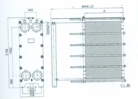 板式換熱器是由固定擋板、板片、移動(dòng)擋板、立柱、上導(dǎo)軌、下導(dǎo)軌及固定螺栓組成。在固定擋板及移動(dòng)擋板之間是一系列被固定的板片。每片板片均有墊圈,所以板片間構(gòu)成相互平行的封閉流道,介質(zhì)在每?jī)蓧K板片之間交替流動(dòng)。